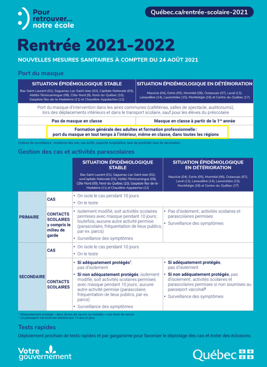 En formation professionnelle, notez que le port du masque est requis en tout temps, à l’intérieur et en classe, dans toutes les régions. Les masques seront fournis aux élèves. Merci de votre collaboration.